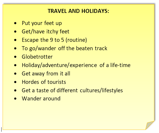 | Get/have itchy feet | To have the feeling that you need to travel and see new places |